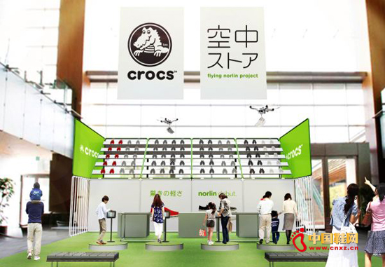2015年3月5日,Crocs在日本发售新款城市 “norlin”。为宣传新产品,3月5日-8日这4天,Crocs在东京六本木的Tokyo Midtown开设了一家“空中店”。顾客通过店内的iPad选择鞋的颜色,就会有Crocs定制的无人机将指定颜色的鞋子“空运”过来。