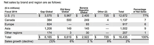 Gap 的 2014 年年报显示,Gap,Old Navy 和 Banana Republic 已做得相当成熟,3 个品牌去年直营店和 Outlets 商店的收入分别是 61.65 亿美元,66.19 亿美元,29.22 亿美元,但其中 Gap 的销售下降了 3 %。 Athleta 的收入没有单独列出来, Athleta 和 Intermix 和 Piperlime 的收入一起计算,去年年收入约为 7.29 亿美元,这三个品牌销售上升幅度是最大的,达到 8 %。