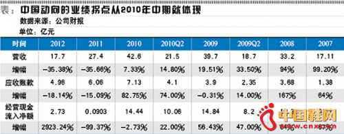 最重要的是,中国动向的营收与应收账款以及经营现金流入净额的背离。这一趋势我们从公司2010年的中期报告已经可以看出。2010年8月25日, 中国动向发布当年中期财报,公司半年营收21.5亿元,同比增长14.8%;应收账款4.1亿元,同比增长74%。应收账款的增长与公司营收的增长完全不 成比例,表明公司为了完成销售,已经开始大量的向经销商发货,但这些确认的收入仅仅是转化为应收账款,公司并未收到现金。