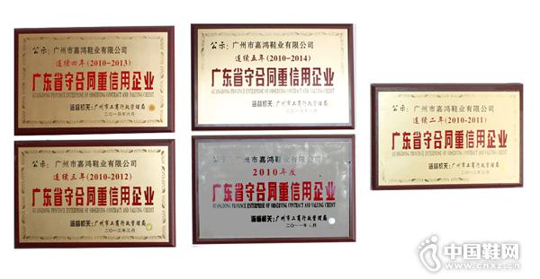 嘉鸿鞋业连续五年获“广东省守合同重信用企业”称号