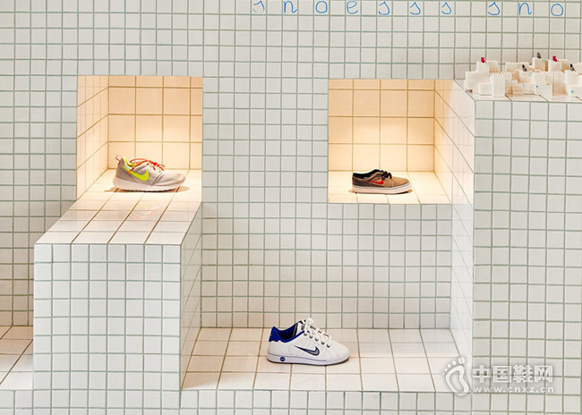 网格状的整体白色背景也更利于衬托出产品本身的色彩与特点。鞋子被整齐地摆放在一系列高低不等的基座上,满足孩童们轻松欣赏鞋子们的需求,而鞋子深深绚丽的色彩则与网格状的白背景形成强烈的视觉对比。