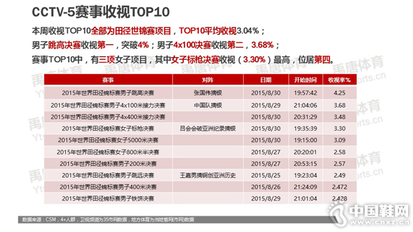 根据我们整理的8月17日到8月23日的收视数据显示:男子100米决赛收视第一,收视率高达3.43%,男子100半决赛收视第二,收视率2.08%,女子铅球的收视率也达到了1.95%。受世锦赛的带动,央视在那周的全天收视数据上升了21.7%,晚间收视率更是上升了33.3%。