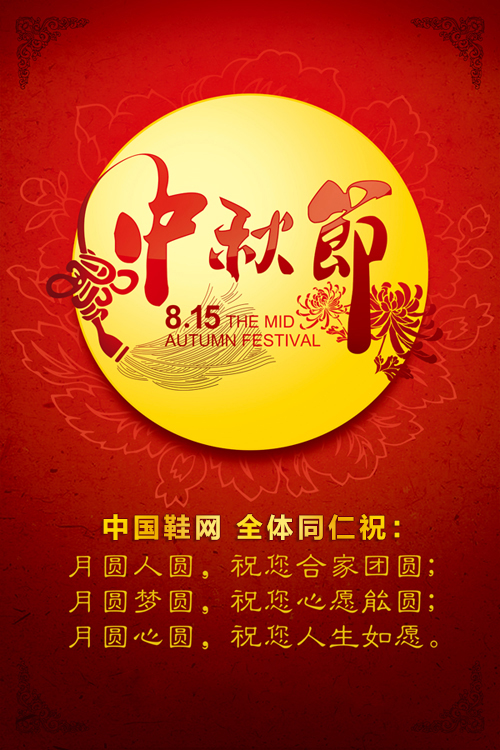 一年明月中秋美,美好月圆喜相连。中秋将至,中国鞋网全体同仁向所有新老客户、媒体伙伴等广大朋友致以最诚挚的问候,祝愿您与您的家人中秋快乐、阖家幸福!同时也借此感谢您一直以来对我们的支持和信赖!