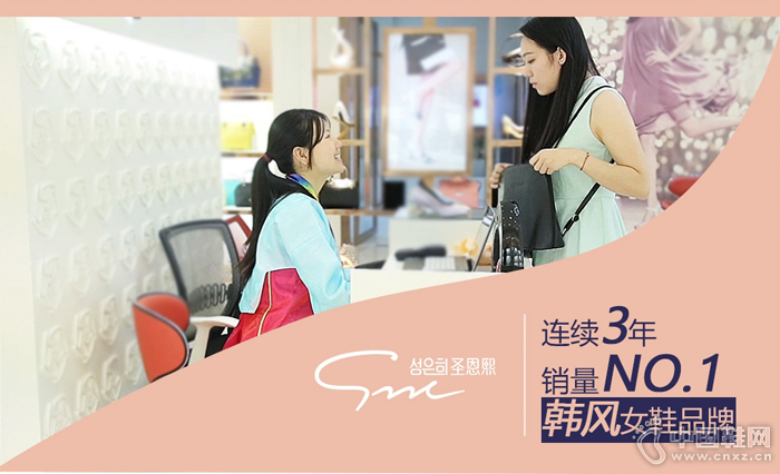 “”品牌源于韩国,2007年在中国上市,是连续三年勇夺中国销量第一的韩版时尚女鞋品牌。近年来,韩剧热播,韩风盛行,圣恩熙作为中国第一韩风品牌,可谓四亿哈韩族的共同选择,其消费群体极为广泛,市场空间巨大。