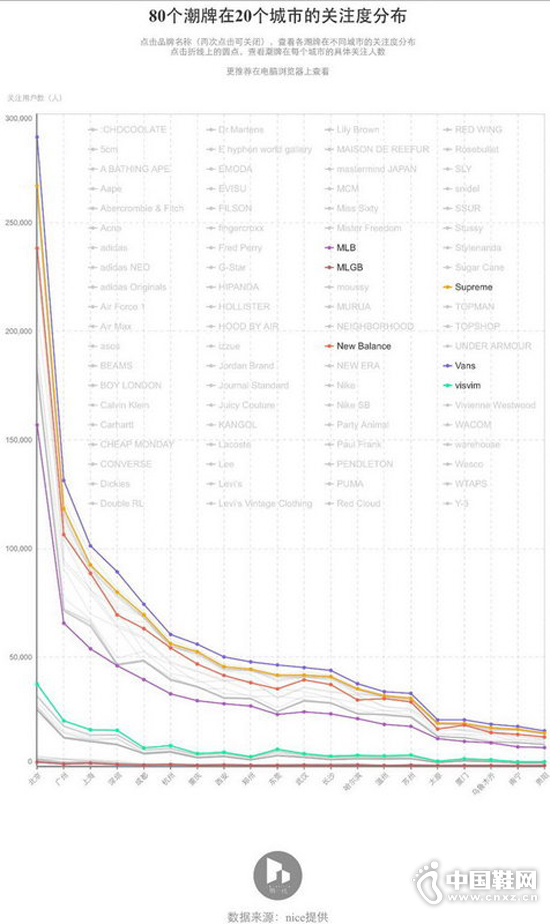 下面的这张图表上共有80个潮牌的关注度分布,你可以明显地看到潮牌们自动归成了三个梯队——从受关注和欢迎的程度上看,像Vans、Supreme、New Balance可以算得上是一线潮牌,而更小众的visvim等则属于二、三梯队。
