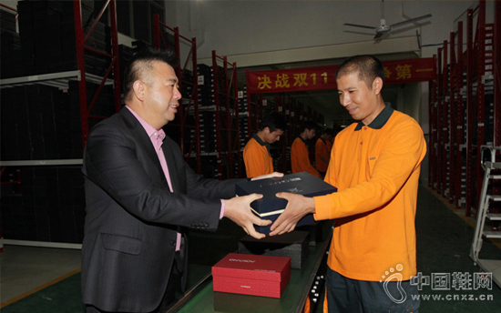 据悉,11月11日零点刚过,不到半分钟的时间,奥康首个订单顺利交易完成。工作人员迅速将这份订单交到了王振滔的手中。王振滔亲自披挂上阵,变身史上最贵的“包装工”:不仅有模有样的将鞋子打包好,还在鞋盒内精心准备了一个寓意吉祥的闰九月的大“红包”,并亲手将封好的包裹交到快递公司工作人员手中。同时,作为奥康的物流合作方,邮政EMS也郑重承诺:“一定会在11日早上8点之前,完好无误地将这双鞋交到客户手中。”