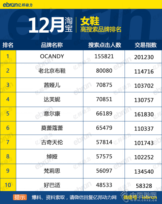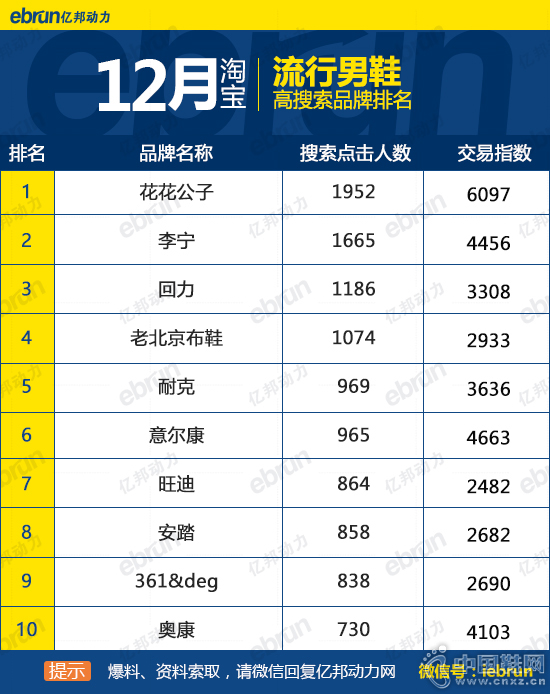 【网-电商频道】12月份淘宝高搜索男鞋女鞋品牌排名: