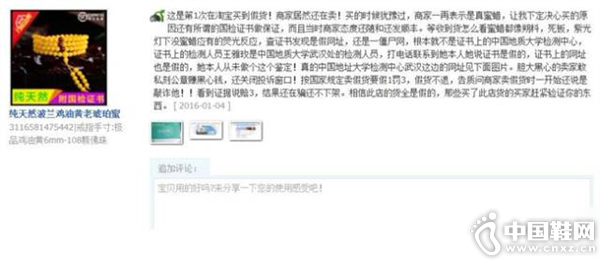 一位消费者在淘宝购买到一款蜜蜡手串,收货后经查验发现,随手串附带的珠宝鉴定证书为假证书,上面的检测人员姓名和检测中心网址以及公章都是伪造的。这位消费者在差评投诉2天内,此商品下架了,但几天后,商家把之前的销售记录全部清零重新上架。消费者举报给淘宝后,客服人员却仍称证据不足。(图片为:蜜蜡手串评论;聊天记录;买的这款蜜蜡的假证书;又上架了的图片)