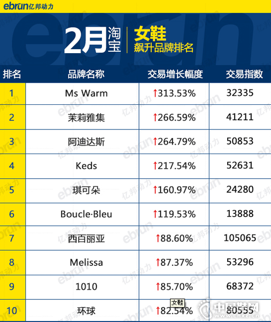 2月天猫淘宝男女鞋飙升品牌top10(图)