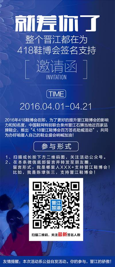 晋江鞋博会 最新快讯, 为了更好的提升晋江鞋博会的影响力和知名度,中国鞋网特别联合泉州、晋江、石狮等地近百家品牌鞋企, 推出“4.18晋江鞋博会百万签名助威活动”,共同为办好咱厝人自己的鞋业盛会呐喊加油!