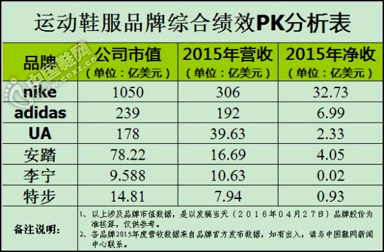 赶超NIKE,还需要多少年?暂且不表。先来看一组数据,NIKE2015年度销售额达到306亿美元,换算成人民币近2000亿,是同期安踏的20倍,净收入32.73亿美元,是同期安踏的8倍,市值这块,耐克1050亿美元,是同期安踏的13倍之多。