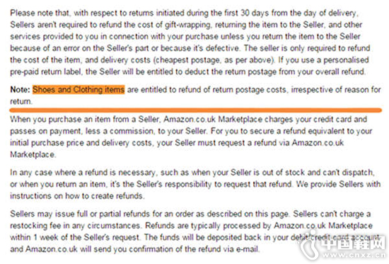 【中国鞋网-电商频道】从外媒近日报道中了解到,有相关人员发现亚马逊“Arranging Marketplace Returns and Refunds”页面上,有条关于卖家负责退货邮费的规定,这对所有服装及鞋子卖家来说,可能是个坏消息。