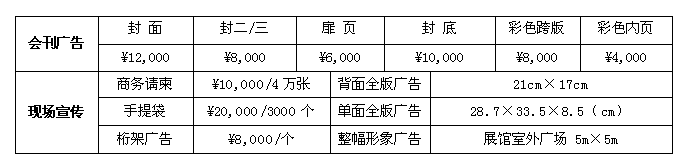 会刊规格为210mm×130mm,广告费一律预收一次性付清;因故不能参展企业,可直接选择会刊及展场广告宣传。