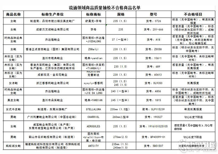 不合格的样品的标称商标涉及:舒曼克 字母、字母、图形商标 杰达隆 JIEDALONG、ZDBaiLi、艳典 yandian、图形商标 天百莉 TIANBAILI、KeLeisiBo克雷斯波、xyxyly 香香莉、艳典 YANDIAN、STELLALUNA、CHARRIOL、AEROSOLES、图形商标 blaihilton 布莱希尔顿、ANTCITY。涉及的主要问题为成人鞋的标识、帮底剥离强度、耐折性能、勾心等项目不符合相关标准要求。
