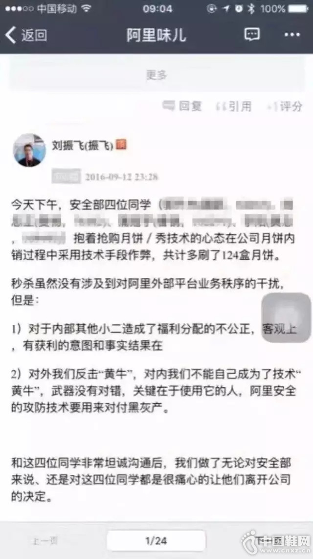 9月12日14:00,阿里巴巴允许内部员工在线抢购月饼,作为福利部分。阿里巴巴安全部门,4位技术员工,利用黑客技术,刷了124盒月饼。这件事情却迅速发酵,阿里巴巴内部决定,为了维护企业文化,对这四人做开除处理。