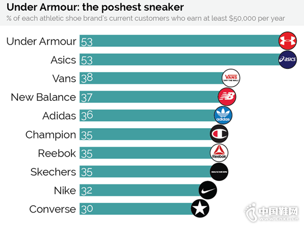 在购买的消费者中,53%的人年收入超过5万美元,排名第一成为最高端的运动鞋品牌。亚瑟士在这项数据上与安德玛基本打成平手,其52.7%的购买者年收入超5万美元。