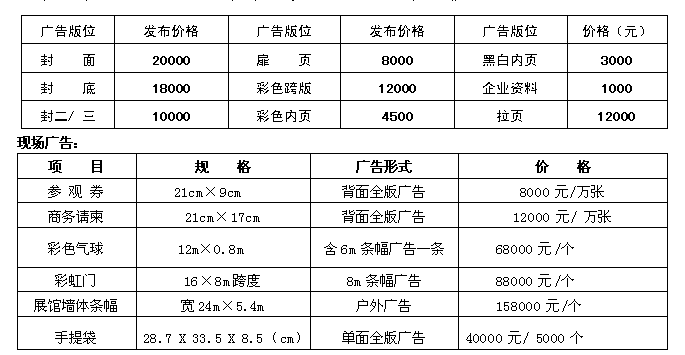 (会刊规格为210MM ×140MM,广告费一律预收一次性付清;因故不能参展企业,可直接选择会刊及展场广告宣传。) 注:彩色广告请企业提供设计好的电子版设计稿,