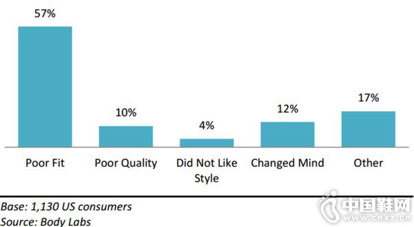 据 Body Labs 今年四月的研究表明,美国消费者线上购鞋的退货率平均达到了20%,而实体店购物和线上购买服装的退货率分别为13%和23%。其中最主要的退货原因就是尺码不合适,其他原因还包括:质量差、款式不喜欢、不想要了等等。(图5)