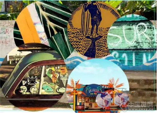 设计理念:以冲浪板和沙滩小径等为主题。混合海滩风格的印花、拓印、50 年代海报为图案。明亮的色彩源自海洋、沙滩、丛林等,设计风格明亮洒脱。