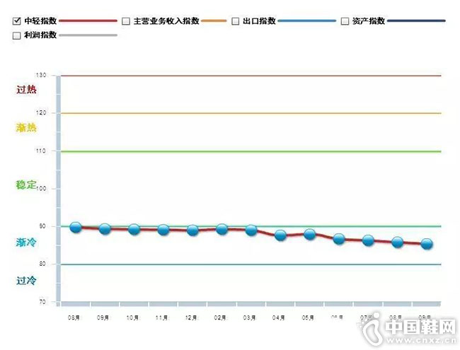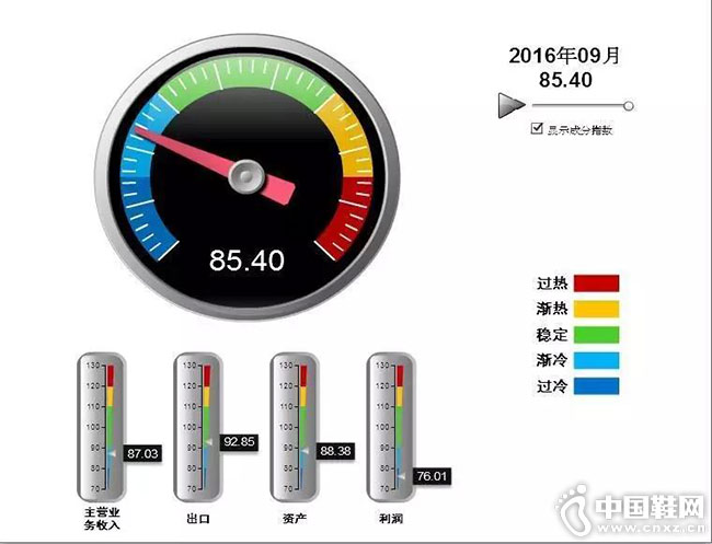 2015年9月至2016年9月,中轻皮革景气指数处于渐冷区间,进入2016年呈现加剧下滑的态势。9月的中轻皮革景气指数为85.40,低于去年(89.39)同期水平,相比上月(85.83)有所下滑。