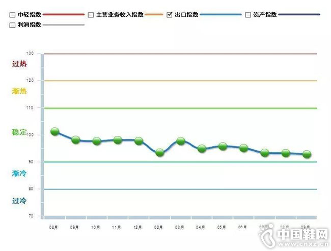 【-数据统计】中国皮革协会联合中国轻工业信息中心发布2016年9月中轻皮革景气指数。9月份中轻皮革景气指数85.40,其中:主营业务收入景气指数为87.03,出口景气指数为92.85,资产景气指数为88.38利润景气指数为76.01。值得注意的是,各项细分指数出现同比、环比全面下滑的态势,只有出口指数处于稳定区间,而资产指数连续6月停留在渐冷区间,利润指数则依旧处于过冷期间,近来更是持续走低。