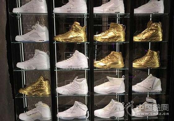 此外,为了庆祝新店开业,不少特别鞋款在巴黎公开发售。其中,一套纯白与黄金配色组成的Air Jordan特别套装最引人注目。在这个套装中,Air Jordan VI、VII、VIII以及Air Jordan XI、XII、XIII等六大系列采用了金色调打造,象征着迈克尔·率领公牛队夺得六次总冠军且创下两次三连冠的霸业。