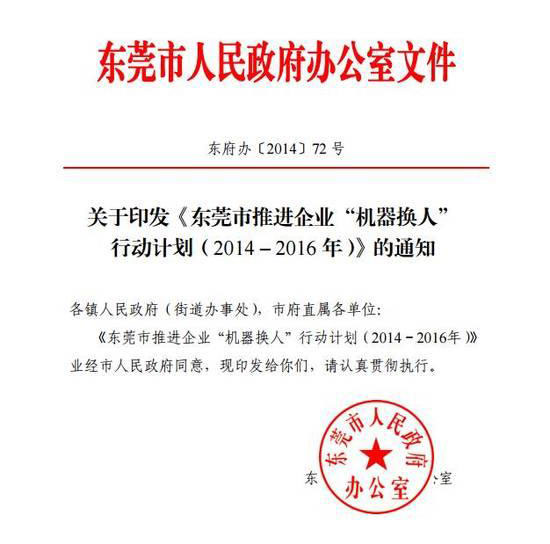 为了应对劳动力成本上涨,进一步推动东莞市制造业转型升级,2014年东莞市出台了《东莞市关于加快推动工业机器人智能装备产业发展的实施意见》、《东莞市推进企业“机器换人”行动计划(2014-2016年)》以及《东莞市“机器换人”专项资金管理办法》等系列“机器换人”政策,宣布在2014~2016年3年连续每年安排2亿元预算用于资助东莞企业的自动化设备技术改造。