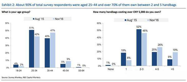 先来说说这个调研针对的人群吧:家庭收入在45万人民币以上,年龄在25-65岁之间。其中,90%的被调查者年龄在25-44岁之间,大概有70%的人拥有2-5个单价在5000元以上的奢侈品包袋。