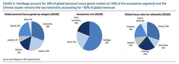 我们可以看到,在所有奢侈品类当中,配件的消费大概占了30%,而在配件这个品类中,包袋的消费又占了59%。