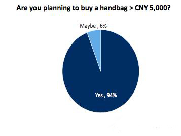在接受调查的女性中,大概有94%的人表示,在接下来的一年里,会花5000块以上,买一个奢侈品的包袋。(一般认为,5000块是奢侈品入门款的价格)。