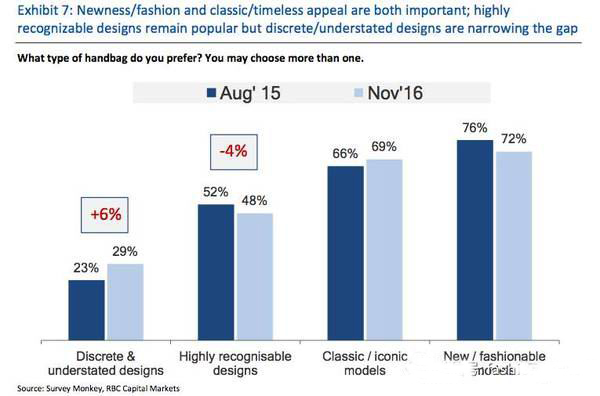 接下来逐一分析,先说包袋的设计,大部分人还是选择最新、最潮流的款式,接着是经典款,然后是特别有辨识度的款式,最后才是特别的、不容易被认出的款式。不过呢,选择最后那个(特别款式)的比例在增大。