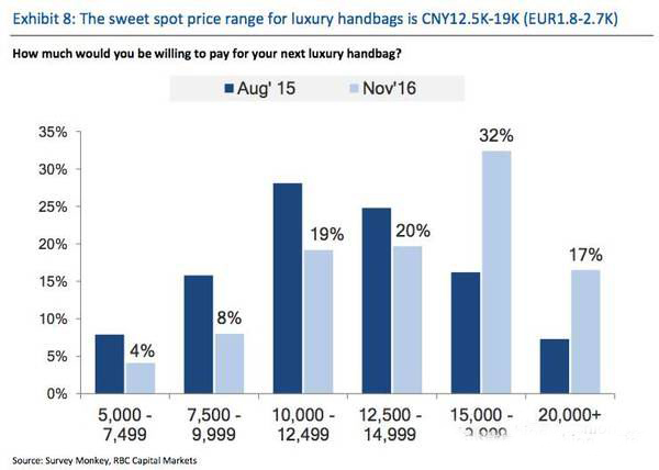 在包袋价格方面,想要购买15000-1999元包袋的女性数目大幅增加,表示想买超过20000元包袋的女性数也增加了不少。