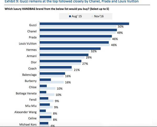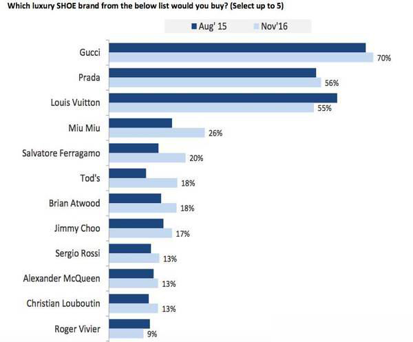 还有啊,很好玩的是,PRADA今年的表现非常糟糕,不过在2017年大家想购买的品牌(包袋、鞋子品类)里,PRADA和同样出自PRADA旗下的Miu Miu排名还挺靠前的。这是说明,PRADA公司的销量增长要回暖了吗?