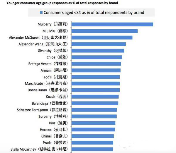 有趣的是,如果你把年龄小于34岁的女性单列出来,会发现他们想要买的品牌非常不同。具体品牌排名见下图,从上到下依次为:Mulberry、Miu Miu、Alexander McQueen、纪梵希、Chloe、BV…