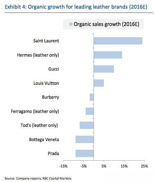 从2016年的销售额增长——也就代表这个品牌的成长速度,YSL的增长速度是最快的,爱马仕的皮具、GUCCI、LV的增长速度紧随其后。