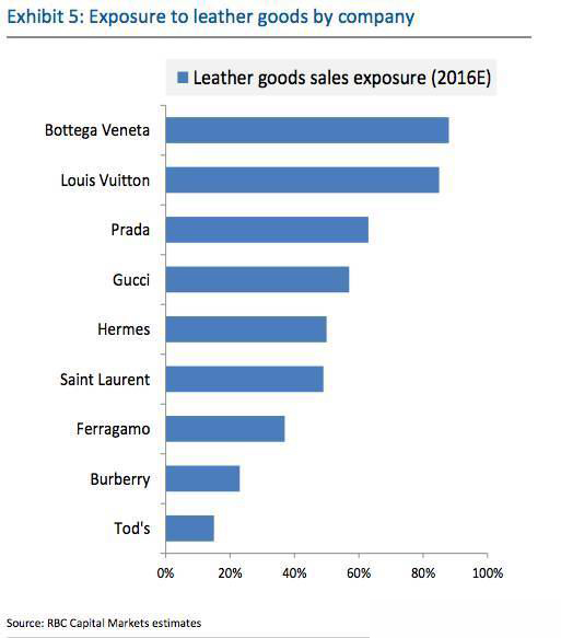 而表现糟糕的品牌(都是负增长)包括:Burberry、菲拉格慕的皮具、Tod’s的皮具,BV、PRADA。
