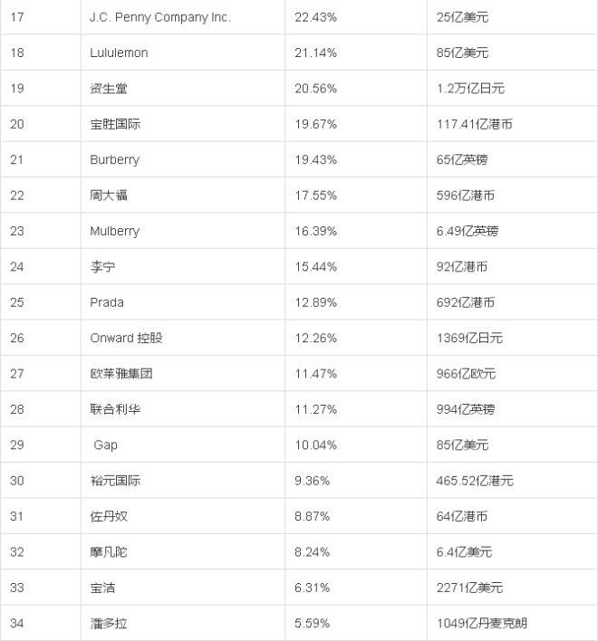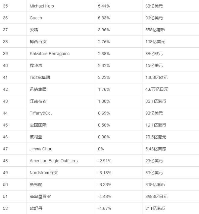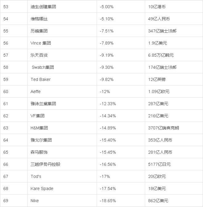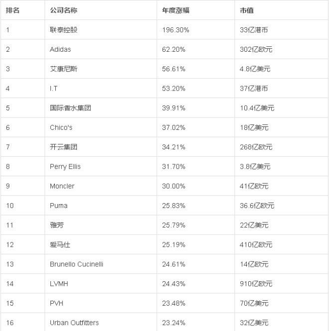 2016全球时尚产业上市公司股票涨幅榜 阿迪第二