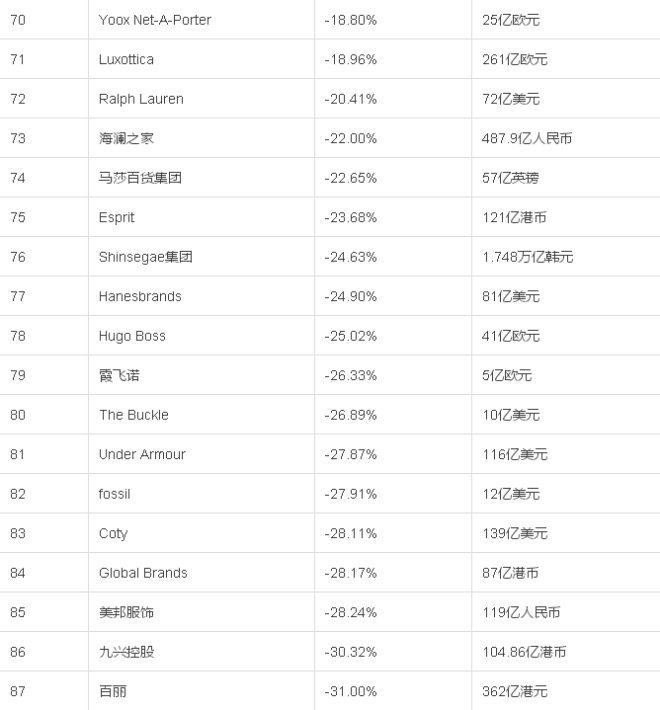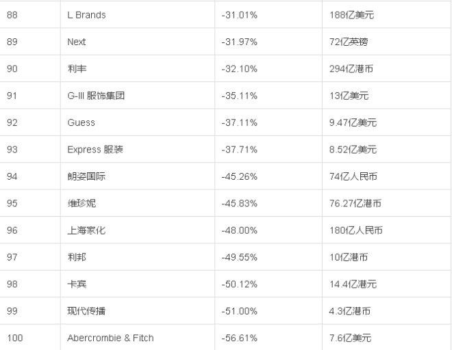 美国服饰品牌业绩持续低迷,在本次统计的100个上市公司中,股价跌幅最大的是Abercrombie & Fitch,录得56%的下跌。Express服装和Guess 均录得37%的跌幅,今年收购DKNY品牌的G-III 服饰集团也录得35%的下跌。