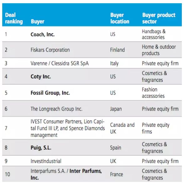 2015 年奢侈品投资并购案中金额最大的买家,其中排名第 3、6、7、9 位的均为私募基金公司,图片(部分)来自德勤报告