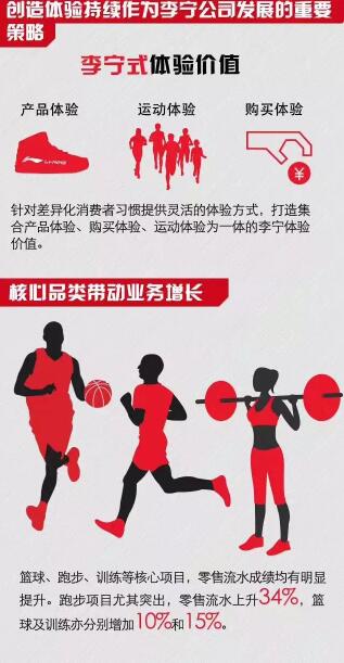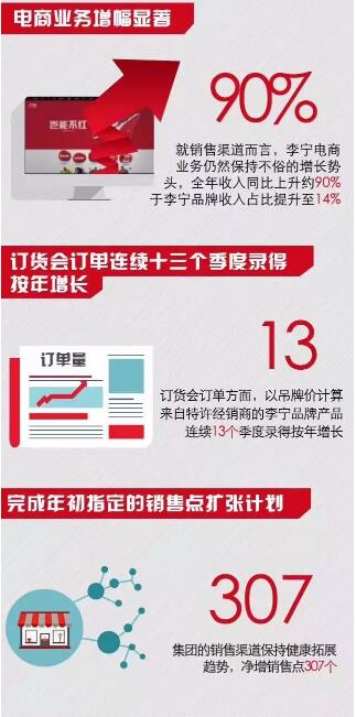 【-品牌动态】近日,李宁发布2016全年业绩,以下数据值得关注:1、收入上升13%,至80.15亿元2、公司盈利达6.43亿元3、毛利率上升1.2% 4、电商业务收入增长90% 5、净增销售点307个....