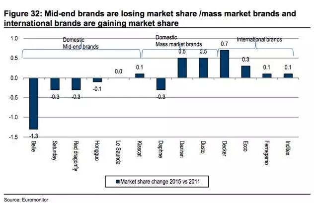 所以我们会看到,Euromonitor发布的国内的中端品牌的鞋,如百丽的市场份额在下滑,而国际品牌的市场份额在上涨,这的确是一个不容忽视的趋势。