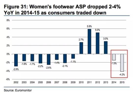 供给的急剧增加对市场的影响还是非常大的,从2014年开始,女鞋的单价就开始下滑,并且在2015年下滑比例达到4.2%。