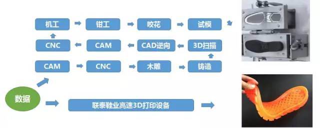 近几年来鞋业的模具厂商和品牌厂商不遗余力寻求新工艺给产业链注入新活力,利用3D打印技术分别在鞋底跟及帮面造型上进行了可行性实践应用,通过3D打印技术实现工艺和设计的优越性,有利的加大了研发效率,注重创意,真正实现加快产品线的优化迭代。3D打印的出现及应用极大简化了鞋模的生产流程,且综合成本更低。普通五面模具加工制作