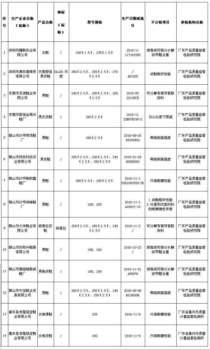 本次抽查了广东省89家企业生产的130批次皮鞋产品。经检验,发现13家企业生产的14批次产品不合格,不合格产品发现率为10.8%。不合格项目涉及皮鞋产品的游离或可部分水解的甲醛含量、可分解有害芳香胺染料、帮底剥离强度、成鞋耐折性能、勾心长度下限值、衬里和内垫摩擦色牢度、勾心规格等7个项目。
