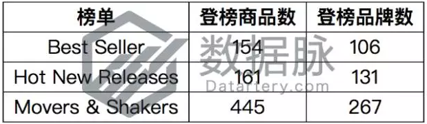 【-电商资讯】衣着与装饰,作为人们物质生活中必不可少的一环,一直是广大网购爱好者最为关心的品类之一,而在跨境电商平台中,各式各样的衣着与装饰类商品争奇斗艳,也形成了一道亮丽的风景线。上周(2017年6月19日-2017年6月25日)亚马逊市场Clothing, Shoes & Jewelry品类商品榜单表现情况如何?一、总体情况2017年6月19日至2017年6月25日共有587款商品登榜亚马逊 Clothing, Shoes & Jewelry品类的相关榜单,其中涉及品牌数350个。截至2017年6月25日,登榜商品总评论数达682219条,平均星级4.24星。榜单的登榜商品及品牌数量情况如下表所示: