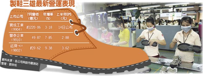 【-市场动态】制鞋业在上半年丰收后,面对第3季营运表现仍乐观,制鞋三雄包括宝成工业(9904)、丰泰企业(9910),及钰齐-KY(9802)等表示,将致力于提升营运效率、產品组合优化,及制鞋基地扩增產量布局。