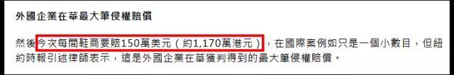 然后今次每间鞋商要赔150万美元(约1,170万港元),在国际案例如只是一个小数目,但纽约时报引述律师表示,这是外国企业在华获判得到的最大笔侵权赔偿。