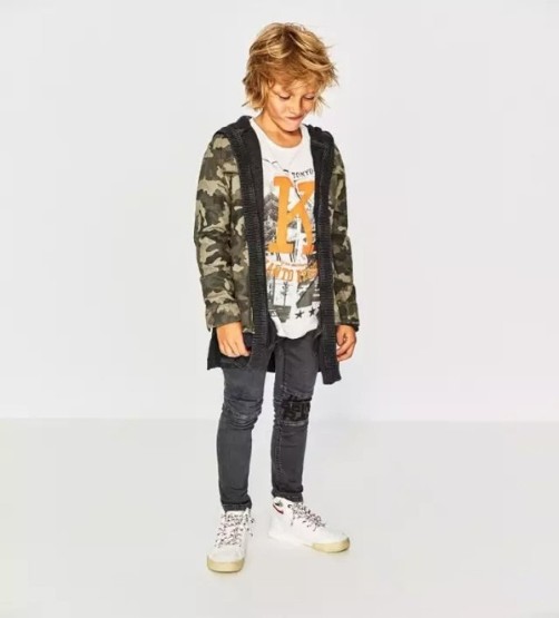【-品牌资讯】侧面开叉的灰色圆领毛衣,不规则的衣摆设计彰显小男孩的个性与不羁。,尽显男孩们的潮范感~喜欢迷彩元素的男孩们这个秋冬可以穿上这款ZARA迷彩外套“大显身手”啦!秋冬必备单品之一的连帽卫衣,将街头风与运动风完美结合,打造时尚酷小子形象。ZARA 2017秋冬男童系列还推出了打底衫,简约不缺时尚感。