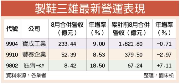 【-品牌资讯】制鞋三雄宝成(9904)、丰泰(9910)、钰齐-KY(9802),8月营运虽受到新台币升值干扰,但仍缴出好成绩。宝成自结8月合併营收233.44亿元、年增9%;丰泰8月营收52.39亿元、年增8.53%,创去年7月以来的单月营收新高。