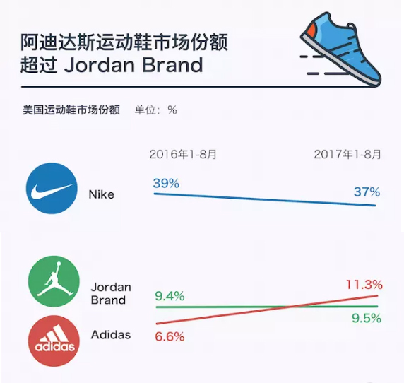 两三年前,几乎没人会预料到能带给这么大的威胁。截至今年 8 月,阿迪达斯美国的球鞋市场份额达到 11.3%,几乎比去年同期的 6.6% 翻了个倍,超过了 Jordan 品牌的 9.5%;第一名仍然是耐克,但它的市场份额有所下滑。